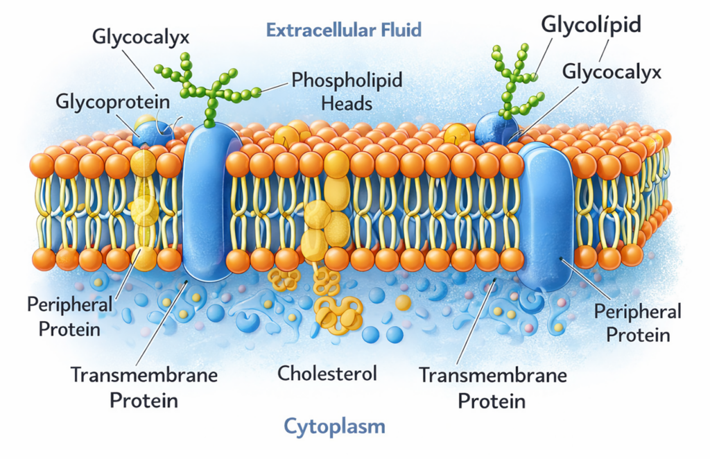 - Cholesterol is embedded within the hydrophobic region and stabilizes the membrane by regulating permeability and fluidity.