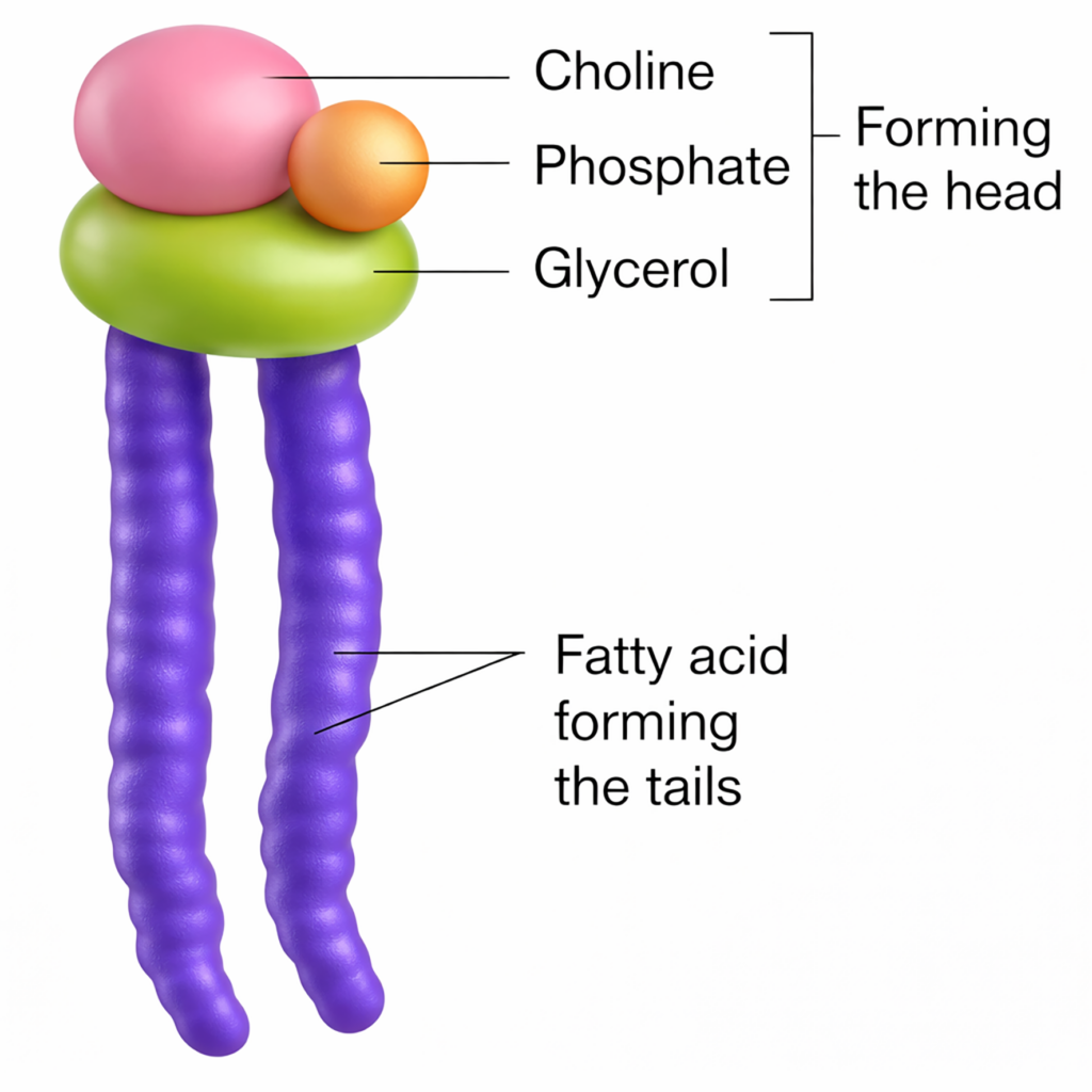 - The polar hydrophilic head contains phosphate or hydroxyl groups that interact with water, whereas the non-polar hydrophobic tails consist of fatty acid chains that avoid water.