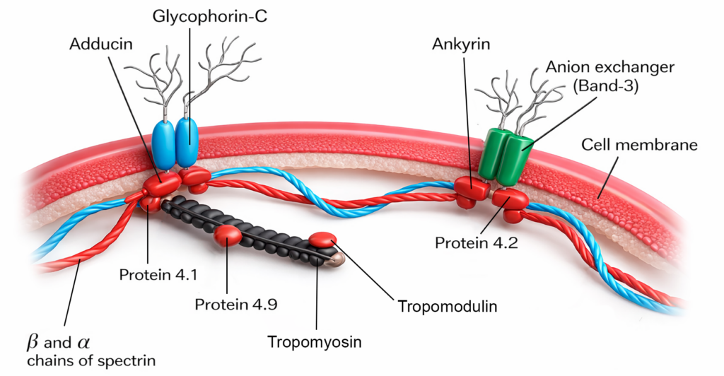 - The specialized membrane proteins—ankyrin, spectrin, and adducin—that form a flexible cytoskeletal network, giving the red cell membrane its characteristic deformability, along with integral components such as the anion exchanger (Band-3), glycophorin-C, and other submembrane proteins.
