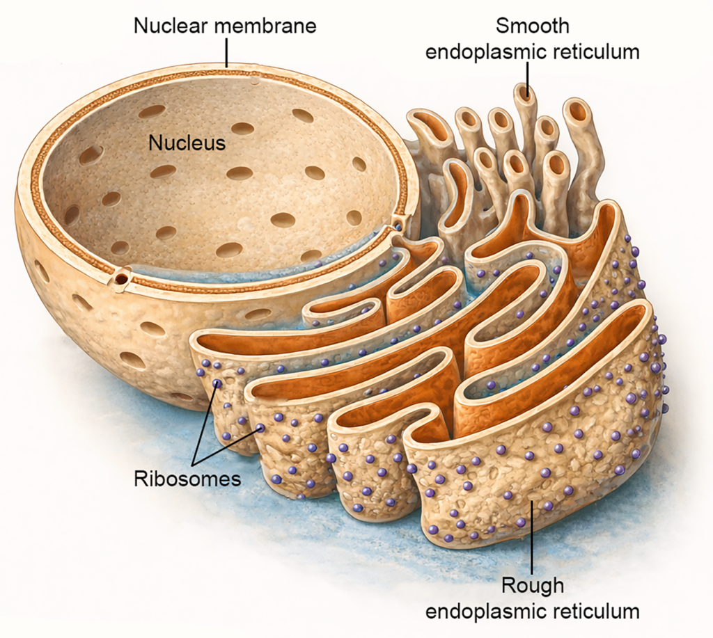 - Its membrane is continuous with the outer membrane of the nucleus and maintains functional connections with the Golgi apparatus.