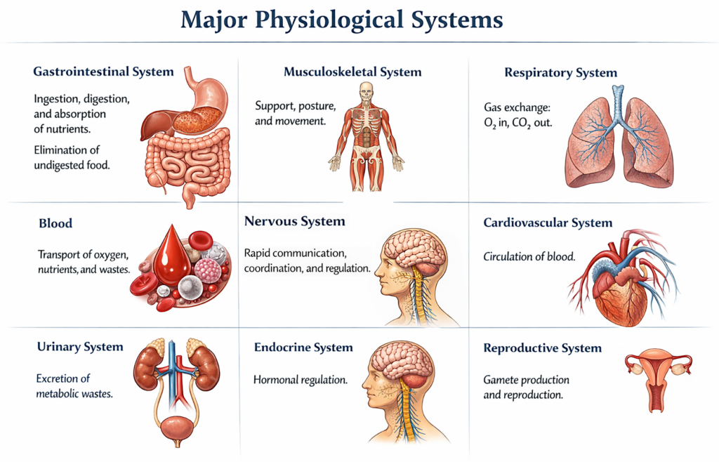 The human body is organized into multiple organ systems that cooperate to maintain survival, activity, and internal stability. These systems perform specialized functions but operate in close coordination to sustain normal physiological processes.